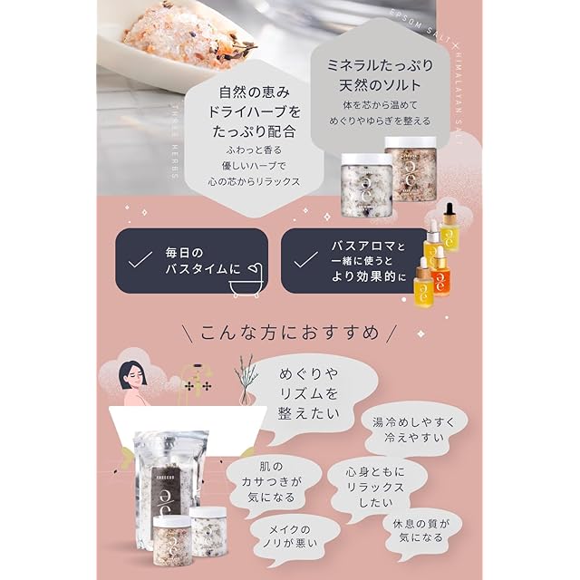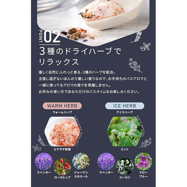 【原材料】エプソムソルト、ヒマラヤ岩塩、ドライハーブ(ラベンダー、カモミール、ローズヒップ)