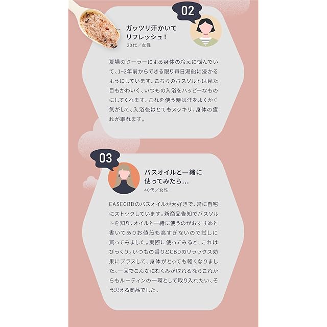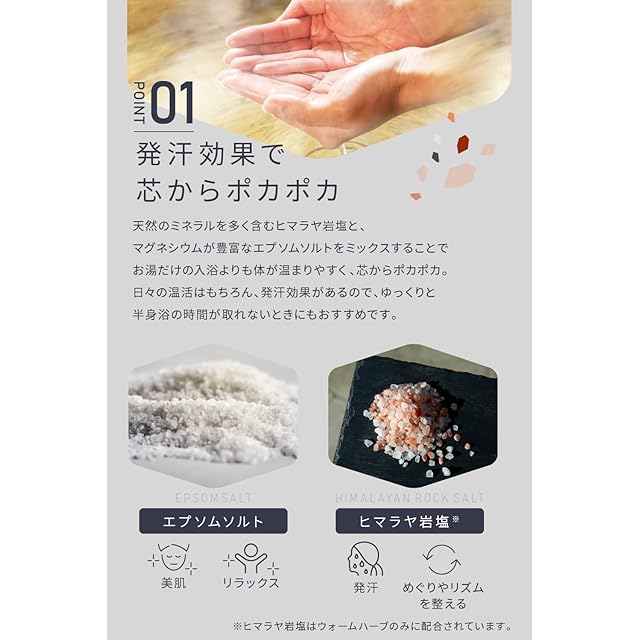 エプソムソルト:欧米では昔から多くの方が好まれてきた入浴剤、家事や仕事で疲れたかたにオススメ。 ヒマラヤ岩塩:約3億年前の純粋なミネラルをたっぷりと含んだ岩塩でお風呂に入れて溶かす事で体から不要なものを追い出してくれます。