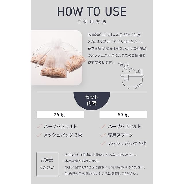 【使用方法】20~40gをオーガンジーに入れ浴槽のお湯に溶かしてご使用ください。
