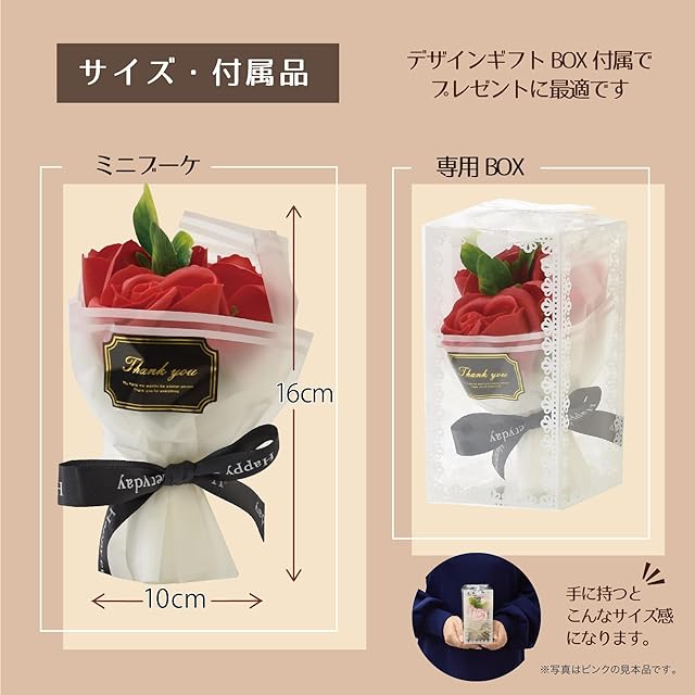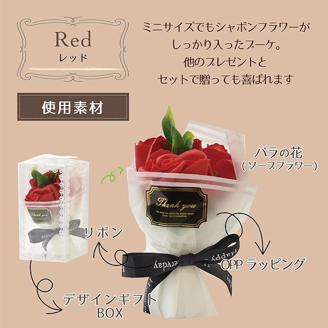 ポピー名古屋 ソープフラワー シャボンフラワー 造花 ギフト プレゼント 3輪ブーケ バラ 花束 約16cm ギフトボックス付き SBL-222 レッド