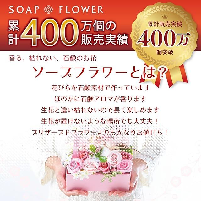 【ソープフラワーの特徴】花びら1枚1枚が石けん素材で作られた観賞用のお花です。プリザーブドフラワーと比べて花弁が大きく、値段がお手頃、石けんのいい匂いがふんわりと香るので人気があります。 生花のように水やりやお手入れの必要がなく、枯れる心配も虫や花粉の心配もありません。