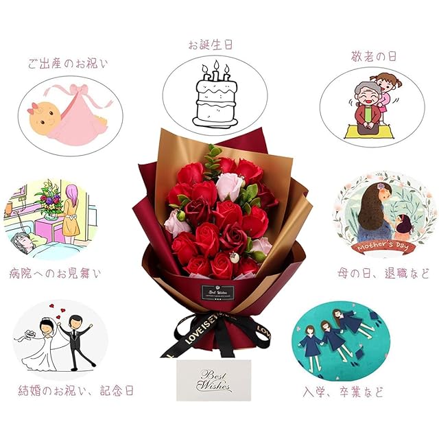✿【大人気なソープフラワー 】:ソープフラワーは花びら一枚一枚が香りのよい石鹸からつくられた、ほのかに香る観賞用のお花です。生花と違って水やりの必要もなく枯れることがありません。ブリザードフラワーとも違ってほのかな香りを楽しめます。花粉等も無いためアレルギーの原因となることもありません。アイディアに満ち溢れ、柔らかな質感、鮮やかな色合いと雰囲気を長い間お楽しみいただけ、彼女、奥様、母の日のプレゼント、誕生日プレゼント、結婚祝い、卒業式など様々なシチュエーションにピッタリです! 感謝やお祝いの事の贈り物として目を引くおしゃれグッズです。