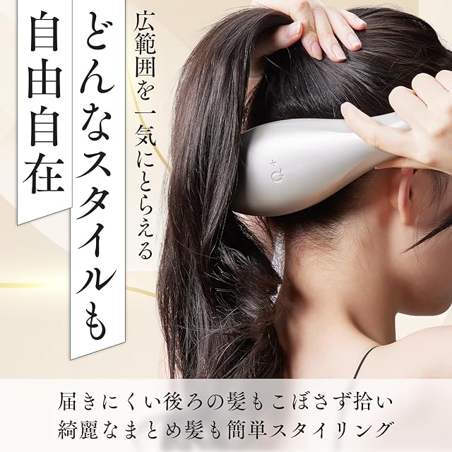 ✨【 こだわりの機能② 】頭の丸みに心地よく沿うカーブヘッド。広範囲を一気にとらえるので届きにくい後ろの髪もこぼさずキャッチ!まとめ髪のスタイリングも簡単に。