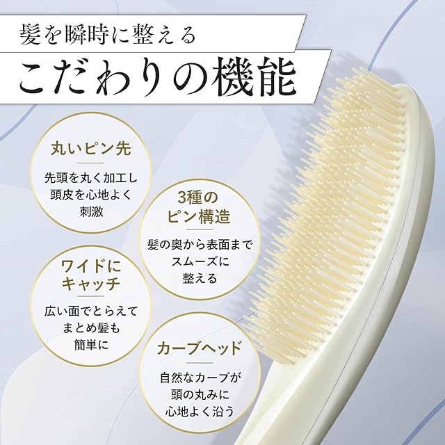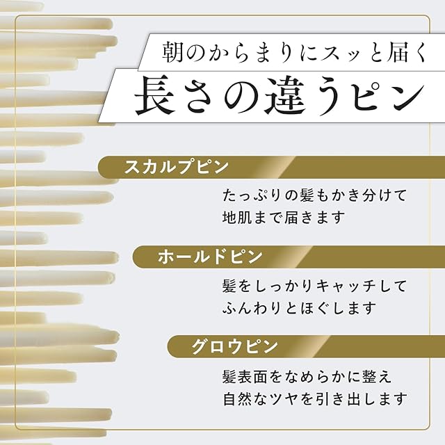 ✨【 こだわりの機能① 】長さの違う3種のピン構造で髪の奥から表面までスムーズに整え、自然なツヤを引き出します。ピン先は丸く加工されており、頭皮を心地よく刺激してくれます。
