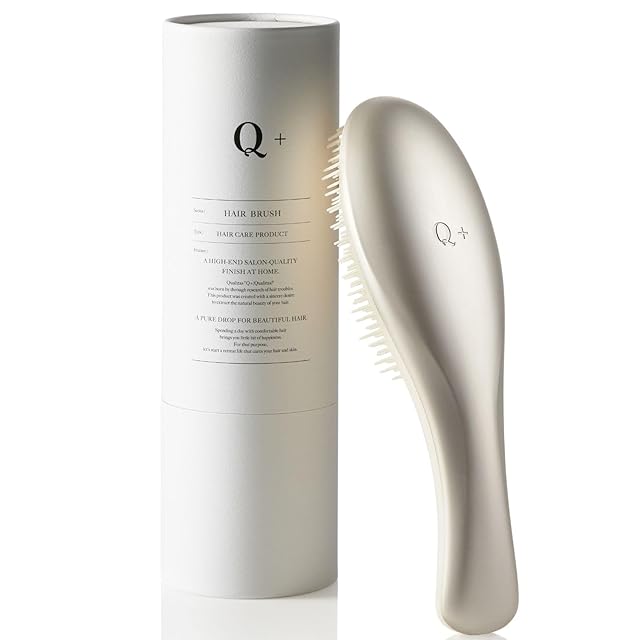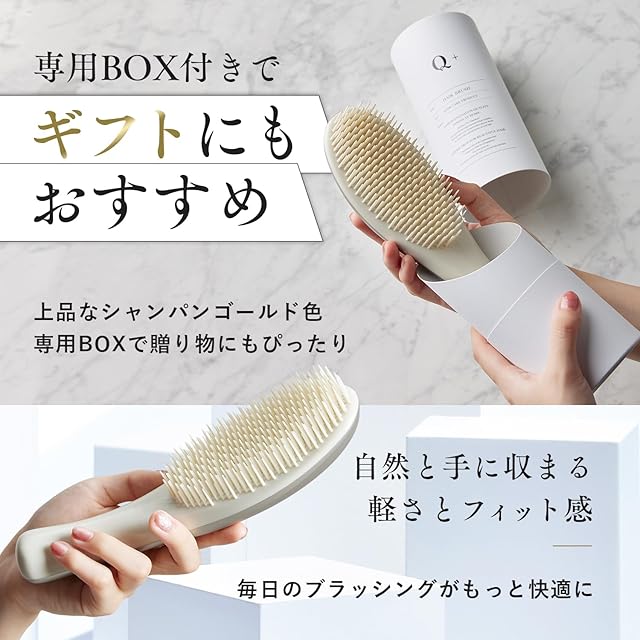 ✨【 サロン品質をご自宅で 】毎日のヘアケアにサロン品質の“クオリティをプラス、Quality + = Q+ ( クオリタス )” ✨【 髪も気分も瞬時にほぐす 】ヘアケアにこだわるQ+から『ヘアブラシ』が登場!髪質を選ばず瞬時にほぐし、サラサラ髪へと導きます。 ✨【 こだわりの機能① 】長さの違う3種のピン構造で髪の奥から表面までスムーズに整え、自然なツヤを引き出します。ピン先は丸く加工されており、頭皮を心地よく刺激してくれます。 ✨【 こだわりの機能② 】頭の丸みに心地よく沿うカーブヘッド。広範囲を一気にとらえるので届きにくい後ろの髪もこぼさずキャッチ!まとめ髪のスタイリングも簡単に。 ✨【 ギフトにもおすすめ 】上品なシャンパンゴールドカラーでスタイリッシュなデザイン。専用BOX付きなので、大切な方への贈り物にもぴったりです。