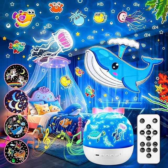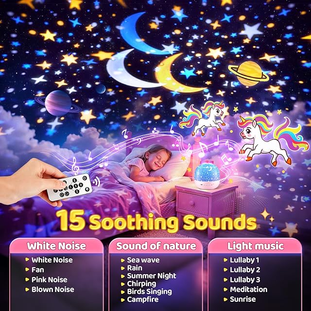 オルゴール 10曲睡眠導入音楽、 15投影フイルム付きのプラネタリウム 家庭用 子供、ホワイトノイズ付きの赤ちゃん オルゴール、リモコン制御のナイトライト、自動タイマー 間接照明、面白いプレゼント 結婚祝い クリスマスプレゼント ギフト 女性 出産祝い 女の子 誕プレ 誕生日 飾り付け