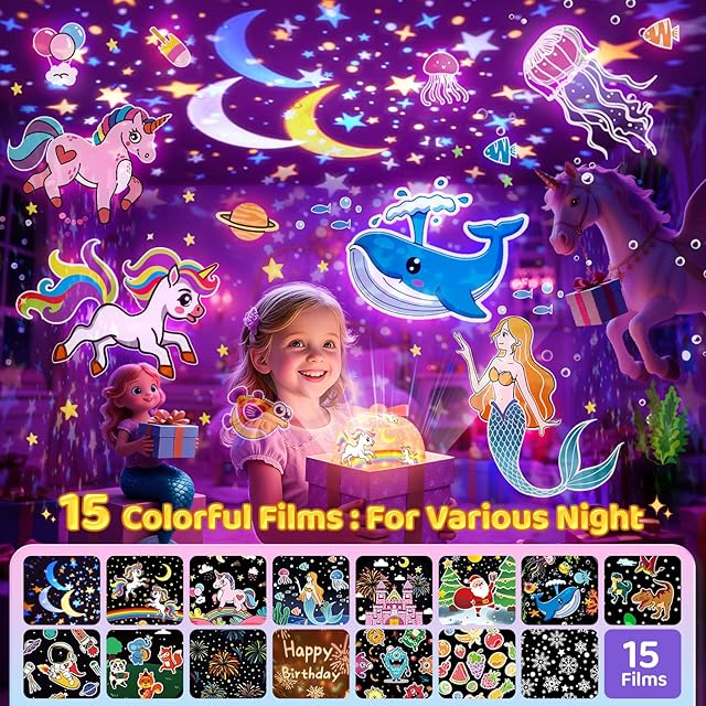 ✨【15種類投影フィルム付きのプラネタリウム家庭用】プラネタリウム家庭用は15セットの投影フイルムがある。お部屋中が童話世界に変わり、星空、キャッスル、人魚姫、ユニコーンの絵柄を見える。知育教育の絵柄は恐竜、宇宙飛行士、動物、海洋動物と果物があります。クリスマス、誕生日、花火、雪、ハロウィーン怪獣の絵柄もあり、祝いプレゼントにもお勧め!子供のプラネタリウム家庭用は三つのLED電球があり、暖光、白光、青光、混色の照明モードがあります。スイッチを長く押すと、360度回転できる。赤ちゃんでも子供たちでも癒される寝かしつけ用プラネタリウム家庭用です。