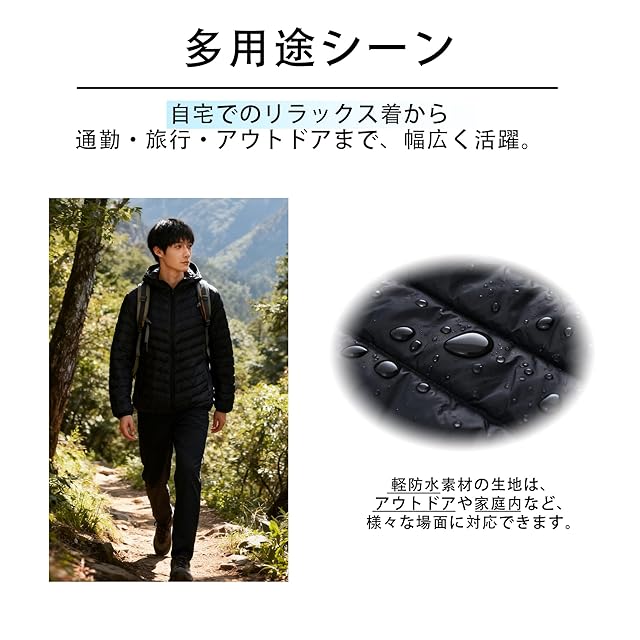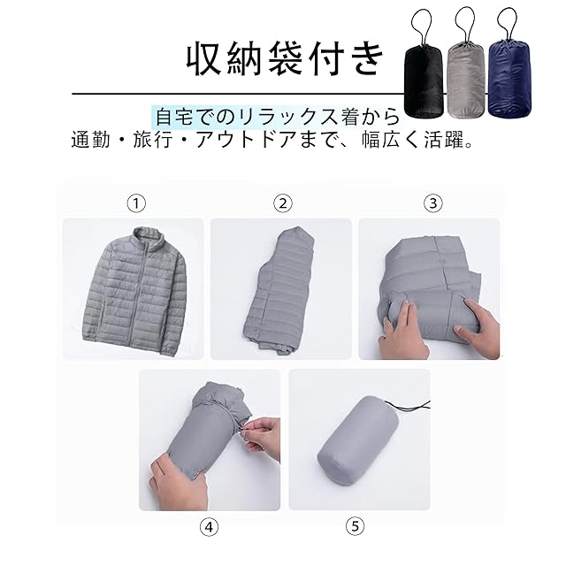 多用途シーン:自宅でのリラックス着から、通勤・旅行・アウトドアまで、幅広く活躍。収納袋付き:1着ごとに専用収納袋が付属。収納後は 500mlの小型保温ボトル程度のサイズになり、持ち運び便利。