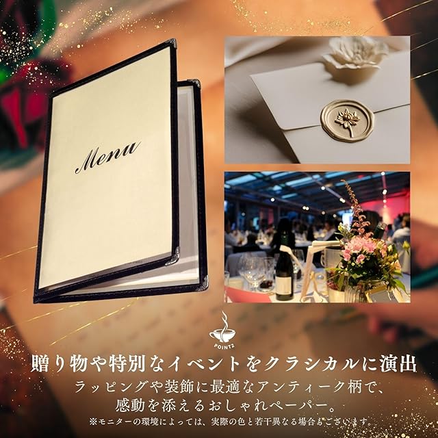 ギフトや特別なイベントを彩るおしゃれ柄:アンティークな柄が、ギフトラッピングや特別なイベントの装飾に最適。クラシックな雰囲気で、贈り物やプレゼンテーションに独自の魅力を添えます。また、招待状、ギフトラッピング、スクラップブック、アートプロジェクトなど、幅広い用途に対応。