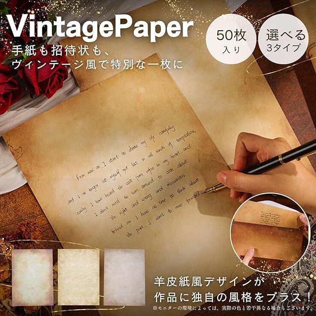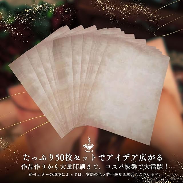 リアルな羊皮紙風デザインのヴィンテージペーパーで本格的な雰囲気を演出:両面印刷されたリアルな古紙風デザインが、手紙や招待状、楽譜、宝の地図などに独自のヴィンテージ感をプラス。特別感のある作品づくりに最適です。<br><br>手書きもプリントも美しく映える多用途ペーパー:プリンター対応で、家庭やオフィスで簡単にビンテージ風の印刷物が作れるだけでなく、手書きにもぴったり。また、罫線がないため、自由にイラストや文字を書き込み、DIYアートやイベント紹介チラシ、オリジナルカード制作に最適です。<br><br>ギフトや特別なイベントを彩るおしゃれ柄:アンティークな柄が、ギフトラッピングや特別なイベントの装飾に最適。クラシックな雰囲気で、贈り物やプレゼンテーションに独自の魅力を添えます。また、招待状、ギフトラッピング、スクラップブック、アートプロジェクトなど、幅広い用途に対応。<br><br>50枚入りでアイデアが広がるたっぷりボリューム:1セットに50枚の両面印刷用紙が入っているので、個人の作品作りからイベント用の大量印刷まで幅広く対応可能。コスパも抜群です。<br><br>セット内容とサイズ:A4相当(28.5cmx21cm) 50枚セット・本物の古紙ではなく、アンティーク風なデザインペーパーとなります。また縦が実際のA4より約1cm短くなっています。