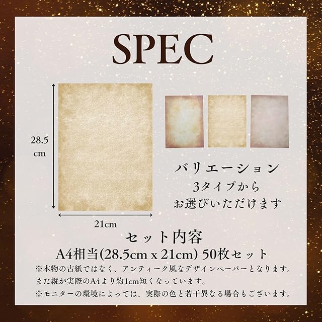セット内容とサイズ:A4相当(28.5cmx21cm) 50枚セット・本物の古紙ではなく、アンティーク風なデザインペーパーとなります。また縦が実際のA4より約1cm短くなっています。