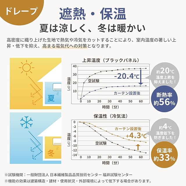 【遮熱保温】高密度に織り上げた生地により、室内温度の急激な変動を抑えます。夏は熱気を遮断し、冷房の効率を向上。冬は外の寒さを防ぎ、室内の暖かい空気を逃がさずに暖房効率を高めます。電気代の節約にも繋がります。