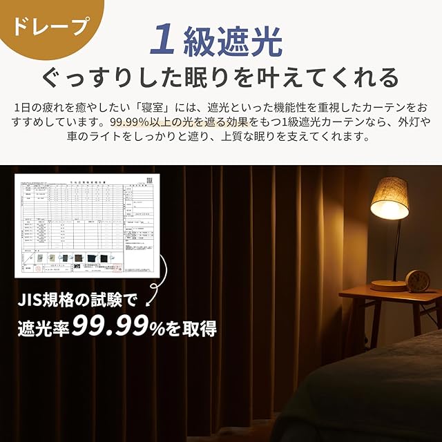 【1級遮光】 ドレープカーテンは、縦糸には透けにくいフルダル糸を、横糸には黒糸を使用し、遮光性が高くなる密度まで詰めて織り上げることで99.99%の遮光効果を実現しました。外光をほとんど遮断するため、昼夜問わず快適にお休みいただけます。シンプルで機能性を重視される方におすすめです。※一級遮光は光を完全に遮るものではありません。光漏れを気にされる方は遮光効果の高い濃色がおすすめです。