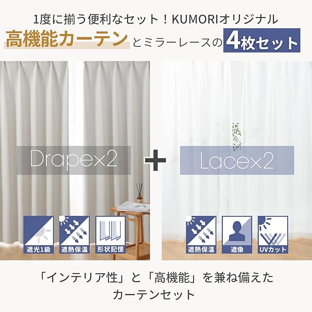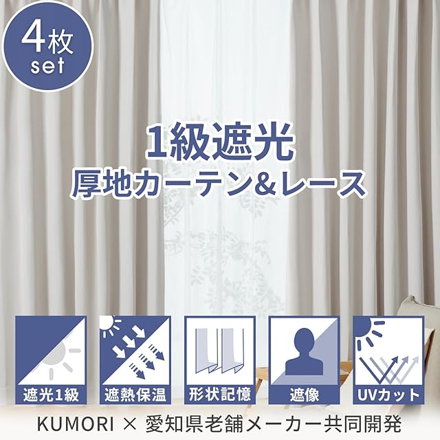 クモリ(Kumori) カーテン 4枚セット 遮光度99.99% 1級 遮光カーテン しっかり厚手 断熱 遮熱 防寒 防音 形状記憶加工 UVカット 遮像 節電効果 省エネ 洗濯可能 無地 寝室 リビング アジャスター フック付き(幅100cm×丈110cm・厚地2枚&レース2枚・ライトグレー)