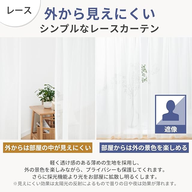 【プライバシー保護・UVカット】ミラーレースカーテンは、軽く透け感のある薄めの生地を採用し、外の景色を楽しみながら、プライバシーも保護してくれます。そして、UVカット機能がついて、太陽の光を取り入れながら、紫外線をカット。お肌や家具を日焼けから守ってくれます。