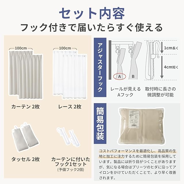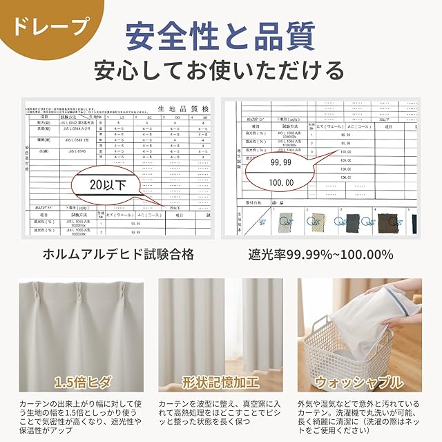【商品仕様】※組成:ポリエステル100%。※機能:遮光1級/遮熱保温/形状記憶加工/遮像/UVカット/ウォッシャブル。※縫製:1.5倍ヒダ/ 2ッ山を採用し、出来上がり幅に対して使う生地の幅を1.5倍としっかり使うことで機能性がアップします。※形状記憶加工:厚地カーテンを波型に整え、ピシッと整った状態を長く保ちます。※セットで届く:厚地2枚とミラーレースカーテン2枚にアジャスターフックがついているので届いてすぐお使いいただけます。