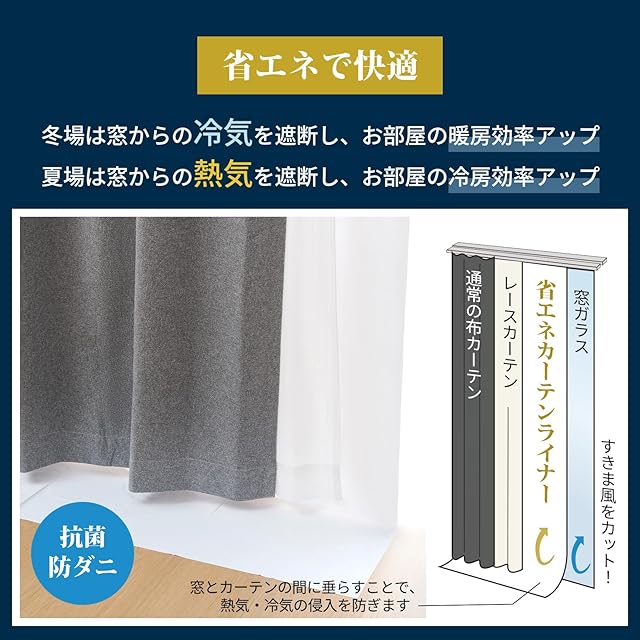【一年中快適&省エネ】窓から入り込む冷気・熱気をしっかり遮断。冬は冷気を防いで暖房効率UP、夏は熱気をカットして冷房効率UP。冷暖房の無駄を減らして、1年を通して快適かつ省エネに。電気代の節約にもつながります。