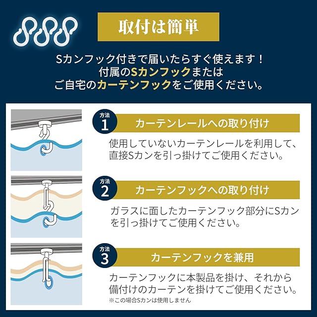 【商品仕様】※組成:本体/塩化ビニル樹脂、Sカン/ポリアセタール。Sカンフック付きで届いたらすぐ使えます!さらに、ハサミやカッターでお好きな長さにカット可能なので、窓のサイズに合わせて自由に調整できます。