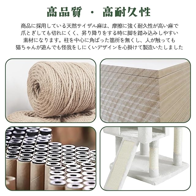 【優れた耐久性】猫 タワー表面全体は柔らかい手触りで小さい子猫も安心に寝れます。キャットタワー モクセイ商品に採用している天然サイザル麻は、摩擦に強く耐久性が高い麻で、爪とぎしても切れにくく、昇り降りをする時に脚を踏み込みしやすい素材になります。キャット タワーの柱を中心に角ばった箇所を無くし、人が触っても、ねこちゃんが遊んでも怪我をしにくいデザインを心掛けて製造いたしました。