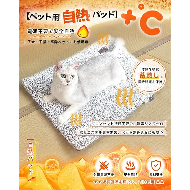 <p>「ペット用 保温 マット」の決定版!電気不要の自熱式で、愛犬・愛猫の快適な安眠をサポート。<br> <p>こちらのペットヒーターは、コードや電池が一切不要の自熱式。ペット自身の体温を効率的に反射・蓄熱する特殊断熱素材を使用しているため、経済的で安全にご利用いただけます。小型犬から猫まで、愛するペットのための防寒・保温対策に最適なペットベッドです。</p> <p>● 抜群の暖かさと快適さ<br> <p>高品質な極細ファイバーと撥水加工を施した超柔らかい表面は、ペットの肉球に優しく、まるで抱きしめられるような温もりを提供。冬場の冷え対策や、シニア犬・猫の関節ケア、子猫の保温にもおすすめです。</p> <p>● いつでも清潔に保てるお手入れの楽さ<br> <p>取り外し可能なカバーは洗濯機で丸洗い可能。消臭機能も備えているので、衛生面でも安心です。ペットの抜け毛やにおいが気になる方にも最適です。</p> <p>● 家中で使える便利さ<br> <p>静音設計で滑り止め加工付き。リビングや寝室はもちろん、キャリーケースの中やサークルの上に敷いても移動せず、安定しています。</p> <p>この猫 マットは、ジャンプで飛び乗ってもずれないしっかりした作り。ペットグッズとして、大切な家族の一員へ贈るギフトにもぴったりです。</p>