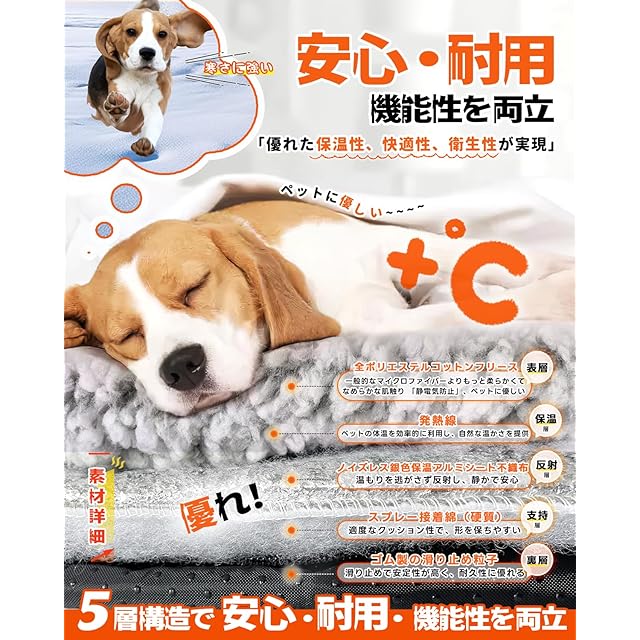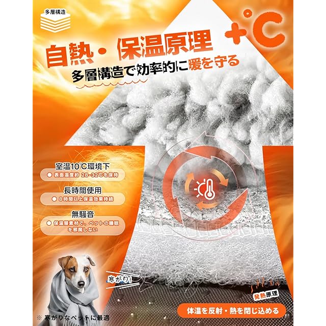 ペットあったかマット【電気不要】:ペット自身の体温を効率よく反射し、穏やかな温もりを保ちます。電気コードや電源が一切不要なので、感電のリスクがなく、室内外を問わず、安心してお使いいただけます。愛するペットのための、安全で心地よい保温環境をご提供します。