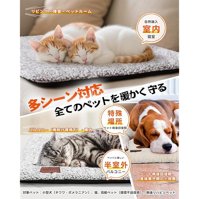 室内外で便利に使用:耐候性に優れた設計で、玄関やベランダ、ガレージ、室外の猫小屋はもちろん、お部屋のソファやクレートの中、ペットベッドの上など、さまざまなシーンで活躍します。ペットの過ごす場所を選ばず、暖かなスポットを作ります。