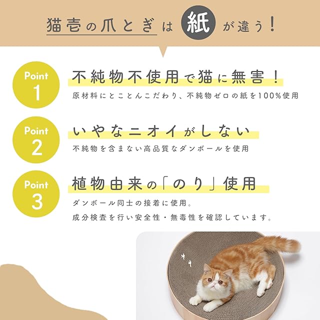 【猫壱の安心品質】バリバリボウルの原料は100%紙のダンボール。 猫ちゃんが毎日使う、猫ちゃんにとって欠かせない存在のつめとぎ、 そしてカラダが直接触れるものだから、品質にはとことんこだわり抜いています。 原料となる紙のうち、10%はニュージーランド産の原パルプ紙を使用しています。 品質の良いダンボールを使用しているので、つめとぎ後のとぎカスも少なくなっています。