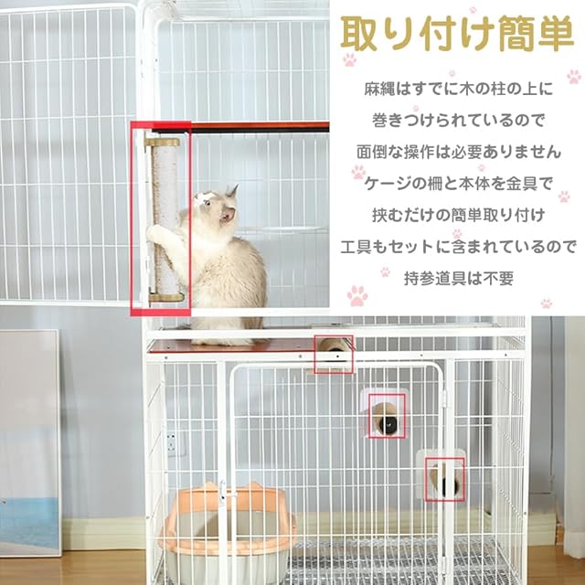 【取り付け简单】:麻縄はすでに木の柱の上に巻きつけられているので、面倒な操作は必要ありません。ケージの柵と本体を金具で挟むだけの簡単取り付けです。工具もセットに含まれているので、持参道具は不要です。
