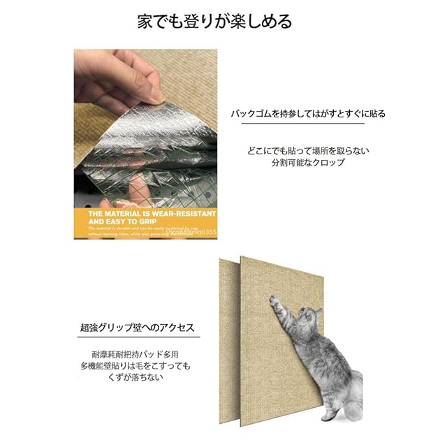 【DIY 取付け簡単 】猫の爪とぎマットは、自己粘着性の背面を備えており、その取り付けは非常に簡単で便利です。猫用の爪とぎマットは、DIYで自由に裁断し、必要に応じて組み立てることができます。背面の保護フィルムを剥がし、床や家具の表面に貼り付けるだけで、素早く設置できます。そのため、異なるサイズや形に合わせて利用することができ、猫の健康を守りながら、家具や床などの表面を保護します。
