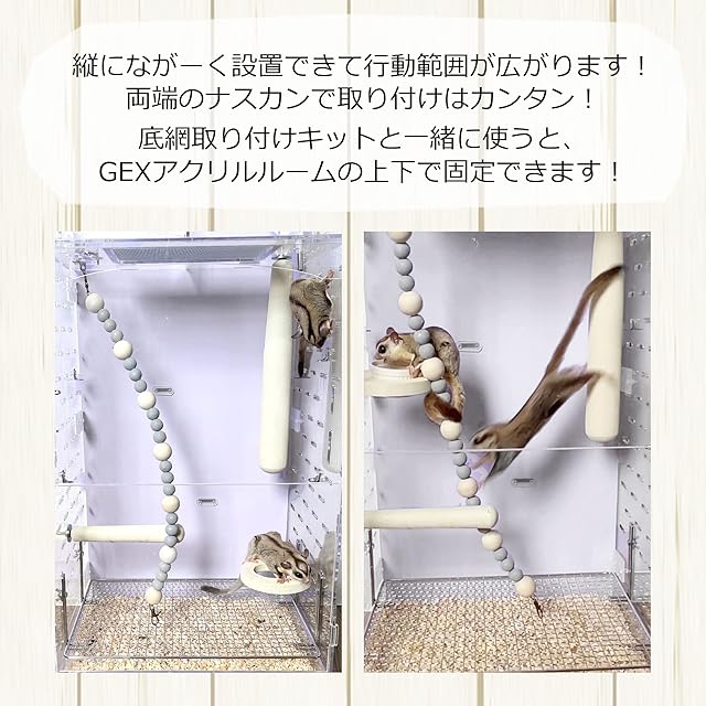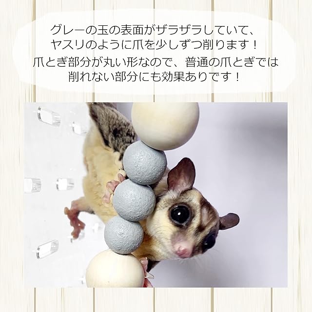 フクロモモンガの爪切り頻度を減らす補助アイテムです。<br>ナスカンでケージに取り付けます。<br>グレーの玉の表面がザラザラしていて、少しずつ爪を削ります。<br>シマリスやデグーにも使えます。<br>個体によっては足裏にも負担がかかるので、様子を見ながら使ってください。<br>