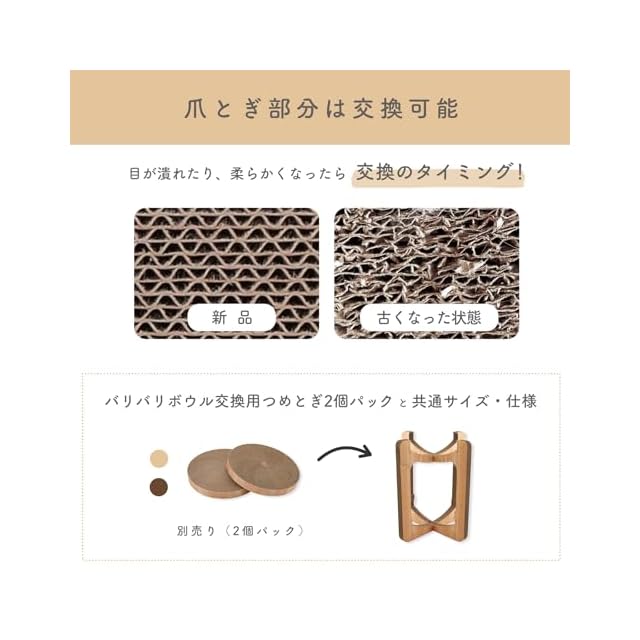 【つめとぎベッドは交換可能&省スペースにも】 つめとぎベッドは、同シリーズの「バリバリボウル交換用つめとぎ2個パック」と同サイズなので、 お気に入りを長くご使用いただけます。 また1つのタワーで2匹分のつめとぎ兼ベッドとして使えて、省スペースにも。