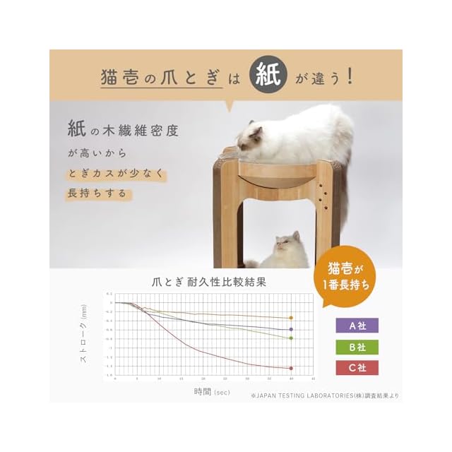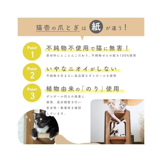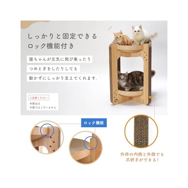 【タワー全体がつめとぎに】 ベッド部分だけでなく、立ち上がってのびのびつめとぎがしたいタイプの猫の希望も叶えます。 ダンボールでできた枠部分の縦ラインもつめとぎ仕様になっています。 外側から立ち上がってのびのび研ぐもよし、つめとぎベッドでゴロゴロしながら研ぐもよし。 タワー全体を余すことなくご使用いただけます。