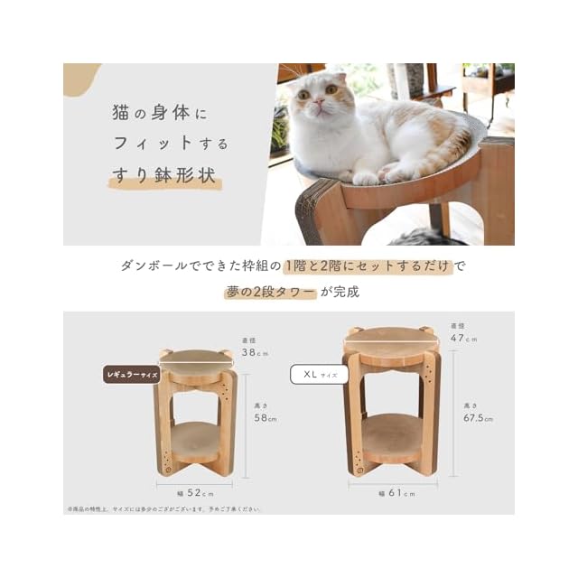 【人気つめとぎが夢のタワータイプで登場】 猫壱の人気商品バリバリボウル。やわらかな猫のカラダにぴたりとフィットするすり鉢構造のつめとぎベッド。 そんな大人気商品が2段タワーになって登場です。 バリバリボウルと同じすり鉢構造のつめとぎベッドを、ダンボールでできた枠組の1階と2階にセットするだけで夢の2段タワーが完成。 ひとりで贅沢使いするもよし、猫ちゃん2匹での同時使いも可愛い事間違いなしです。