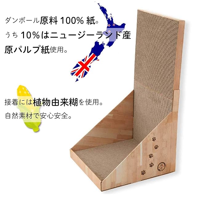【こだわり抜いた原材料】つめとぎ部分に使用しているダンボールは、 原料の100%が紙。内10%はニュージーランド産原パルプ紙を使用。 大切な猫に使用するつめとぎなので、品質にはとことんこだわりました。 原料の品質が良いため、とぎカスも出づらくなっています。 また、つめとぎ部分は目の細かい、薄いダンボールを張り合わせているので、 密度が高く、猫のとぎ甲斐アップだけでなく、耐久性も持たせています。 ダンボールを貼り合わせる糊は植物由来の糊を使用しています。"