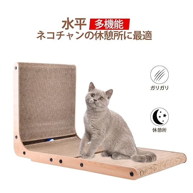 【多機能L型猫爪研ぎ】L字型のデザインで、床に平らに置いて愛猫たちが最高にくつろげ、壁に垂直に立て背伸びしてガリガリ爪とぎし、ひっくり返してスロープにして登ったり降りたり、猫用スクラッチャーの使い方は様々です。猫の好みに合わせて、水平、垂直、スロープのいずれかを選んでつめとぎすることができます。