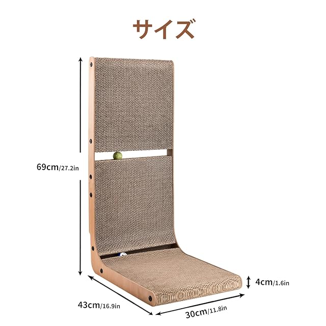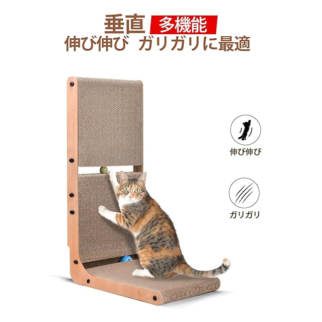 商品名:AUSCAT 猫 爪研ぎ 段ボール ガリガリウォール L字型猫 つめとぎ おもちゃボール付き 縦型 H69cm