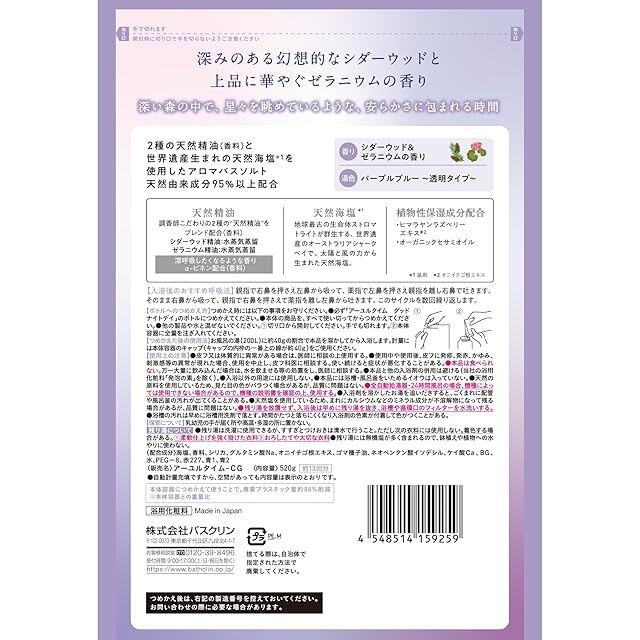 商品名:アーユルタイム グッドナイトデイ バスソルト シダーウッド&ゼラニウムの香り つめかえ用 520g(約13回分) 天然精油