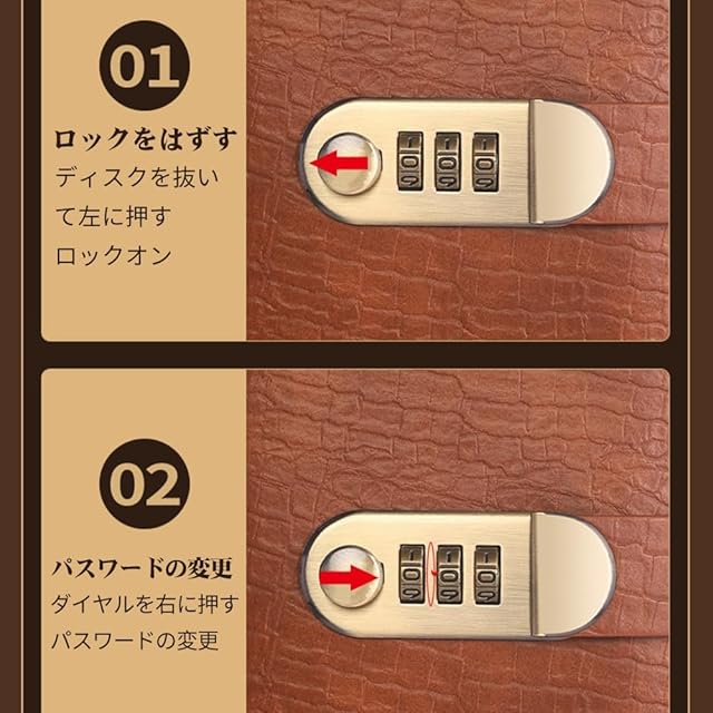 パスワードロックの使い方:ダイヤルを左に押すとロックが解除され、ダイヤルを右に押すとパスワードが変更されます。