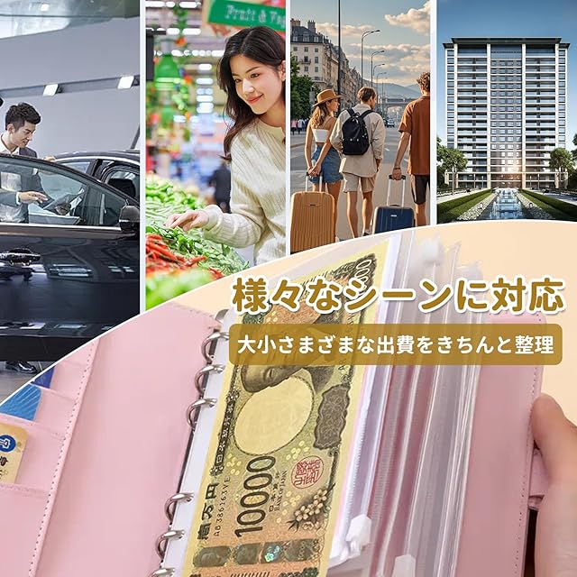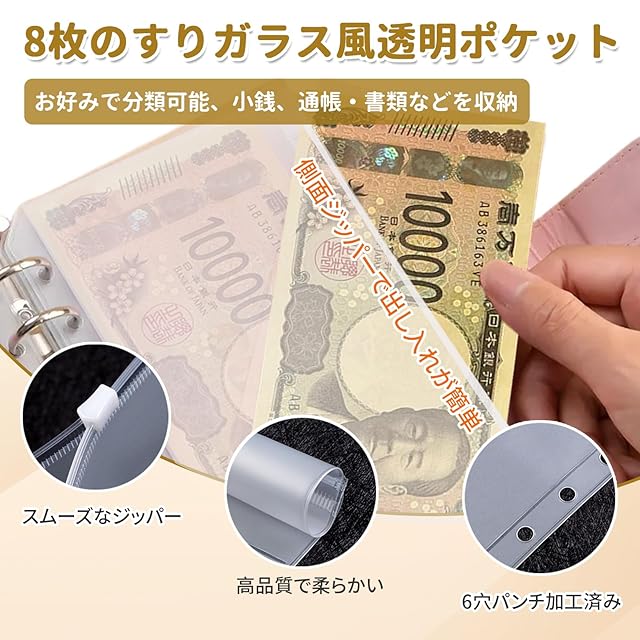 商品名:雲見 お金管理ポーチ A6 貯金バインダー お金わけるファイル 8個付き 6穴 経費予算シート12枚付き PUレザー 現金管理 システム手帳 家計簿 書類 伝票 名刺 メモ紙入れ (ピンク)