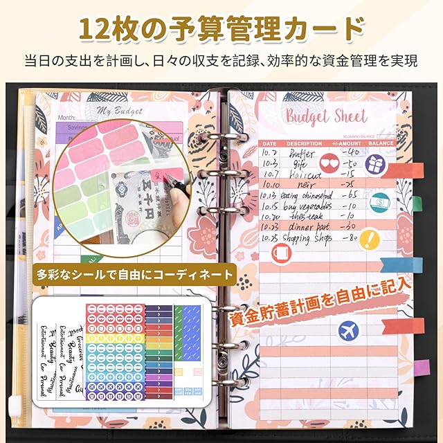 【現金予算カード12枚付き】専用の現金予算カードが12枚付属。日々の収支を記録し、支出パターンを可視化します。これにより家計の流れを一元管理でき、財務コントロール感が格段に向上します。