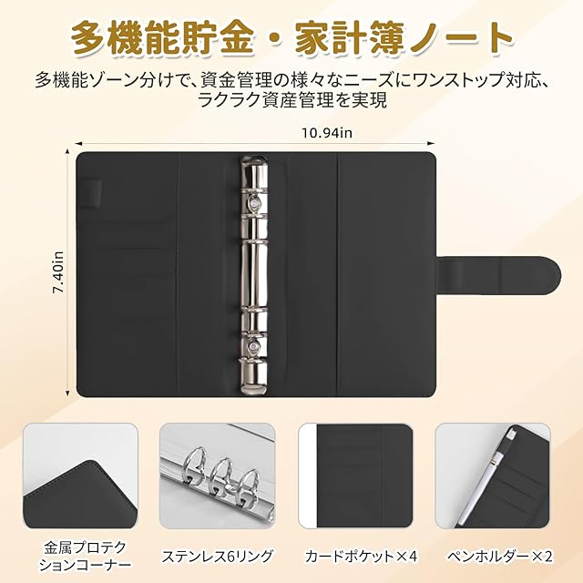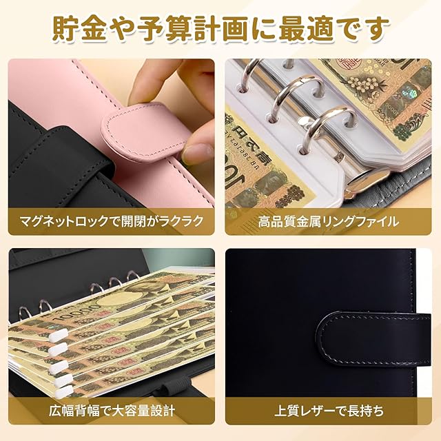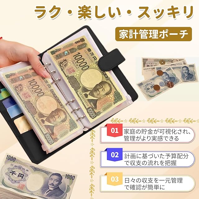 【PUレザー・貯金バインダー】外装はおしゃれなPUレザーを採用し、落ち着いた単色デザインで、様々なシーンで洗練された品味を発揮します。優れた耐摩耗性に加え、手入れも簡単で、汚れが付着しても湿ったタオルで軽く拭き取るだけで清潔が保て、長くご愛用いただけます。 【多機能・現金管理システム手帳】このお金管理ポーチには、PUレザー製カバー、透明ファスナーポケット8枚、予算管理シート12枚、多様なステッカーが含まれており、十分な収納スペースで、銀行カード・クレジットカード・名刺など各種カード類から、証書や紙幣などまで一元管理でき、資産を体系的に整理できます。 【家計管理・ファスナーポケット8枚付き】セットにはPVC製ファスナーポケット8枚が付属。滑らかなマット質感で使い心地が良く、6穴加工で使いやすい設計。計画に応じて小銭、証書、請求書などを分類収納できます。サイドオープン式のファスナー設計で出し入れがより便利。多様なラベルシールが付属し、書類の分類整理と検索効率を高めます。 【現金予算カード12枚付き】専用の現金予算カードが12枚付属。日々の収支を記録し、支出パターンを可視化します。これにより家計の流れを一元管理でき、財務コントロール感が格段に向上します。 【収納力抜群・携帯性に優れる】側面に4つのカードポケットを配置。両側に計2つのペンホルダーを装備。中央には高品質ステンレス製リング機構を採用し、6穴用紙とファスナーポケットをしっかり保持。閉じた時のサイズは約17cm×20cm×3cmとコンパクトで、各種イベント、セミナー、商談などに持ち運びに最適です。