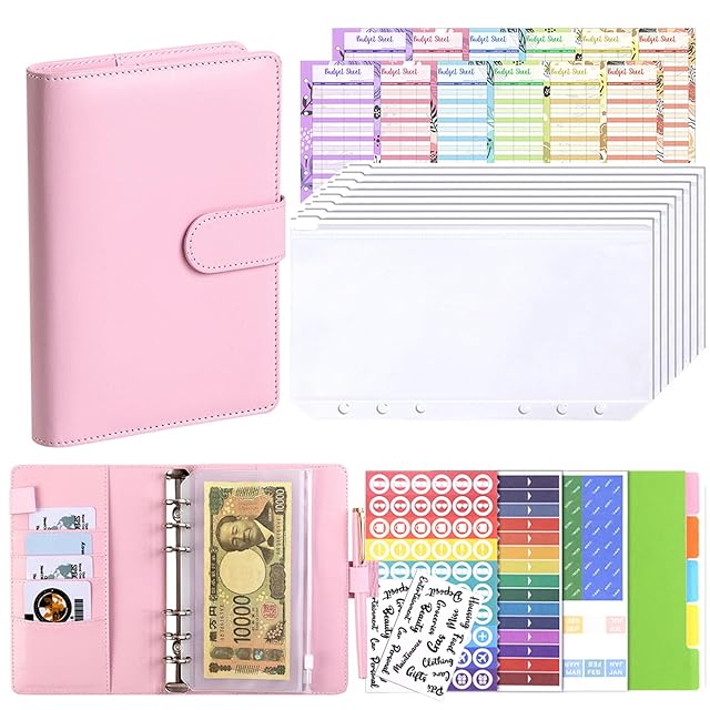 雲見 お金管理ポーチ A6 貯金バインダー お金わけるファイル 8個付き 6穴 経費予算シート12枚付き PUレザー 現金管理 システム手帳 家計簿 書類 伝票 名刺 メモ紙入れ (ピンク)