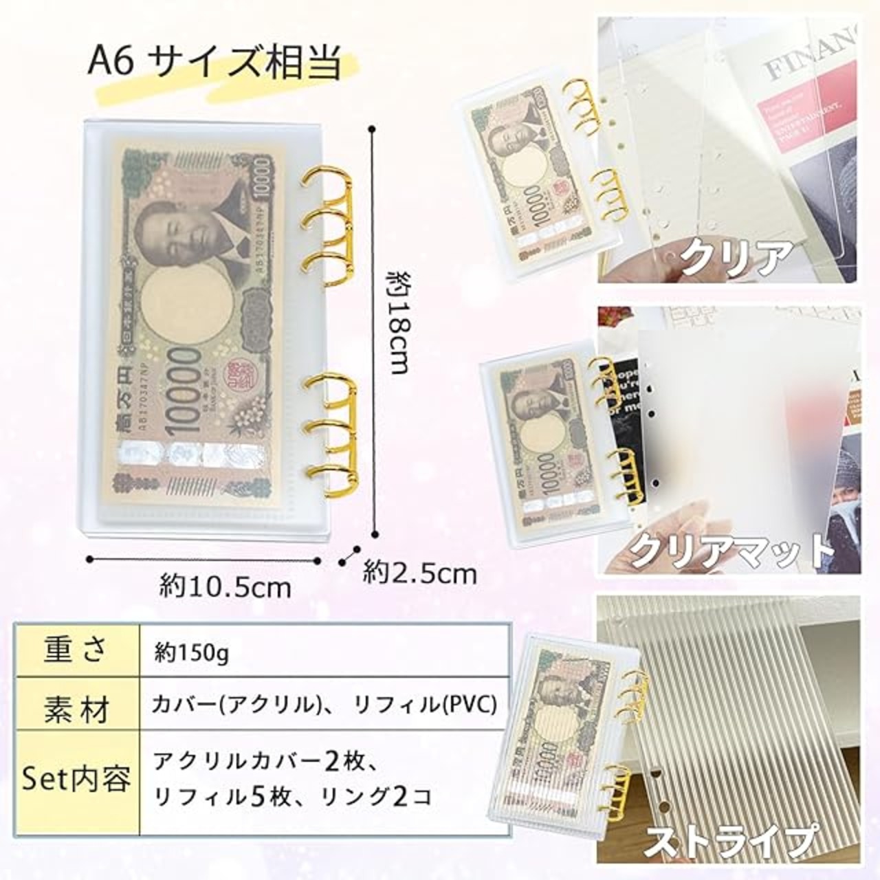 ✅【仕様・サイズ】 カバーサイズ:約18.5cm × 13cm(A6サイズ) リフィルサイズ:約17cm × 10.5cm 材質:アクリル(カバー)、PVC(リフィル) デザイン:クリア、ストライプ、クリアマット セット内容:アクリルカバー2枚、リフィル5枚、リング2個