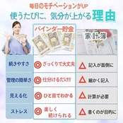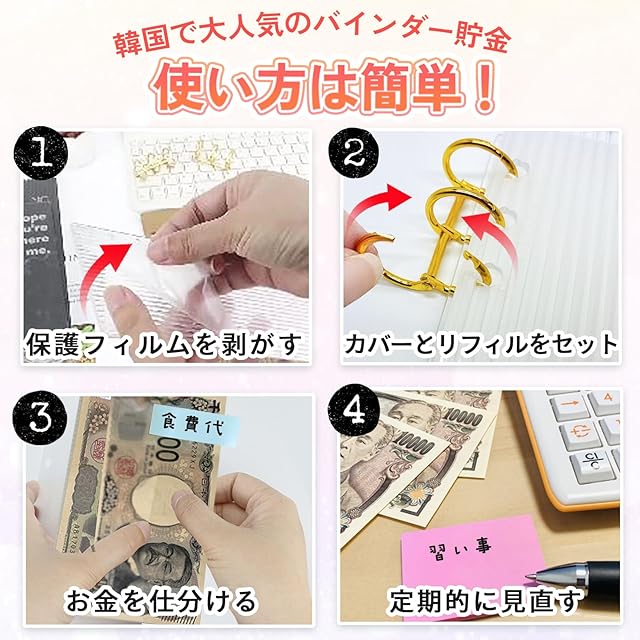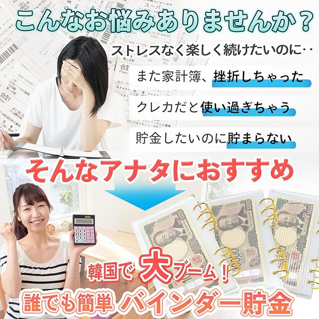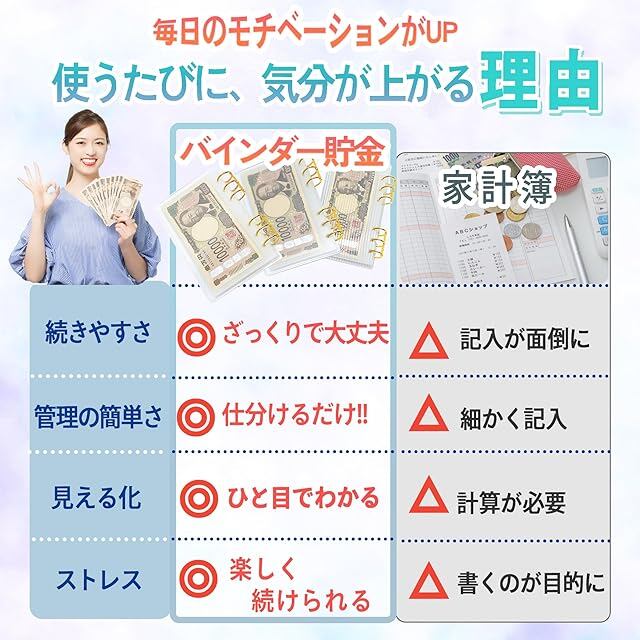見える貯金で、夢が近づく。お金と仲良くなる私の新習慣<br> もう挫折しない!あなただけの「バインダー貯金」<br> 見える化で変わる、5つの嬉しい効果<br> <br> 1.無駄遣いが自然に減る<br> お金の残りが一目でわかるので、衝動買いの癖が自然に改善されます。封筒貯金をよりスマートにした方法です。<br> 2.無理なく続く貯金習慣<br> 面倒な記録は一切不要。お金を仕分けるだけのシンプルさで、誰でも続けられます。saving challengeにも最適です。<br> <br> 3.レシートにサヨナラ<br> レシートを溜め込むストレスから解放されます。貯金封筒として使える透明ポケットで、日々のお金管理が驚くほど楽に。<br> <br> 4.自由な時間が増える<br> 家計簿とにらめっこする時間が激減し、1日たった30秒で管理が完了。家計管理の負担が減り、自由な時間が増えます。<br> <br> 5.夢への一歩が身近に<br> 透明ポケットで貯金が増える様子が見えるので、目標達成が現実味を帯びます。目的別に貯めることが楽しくなります。