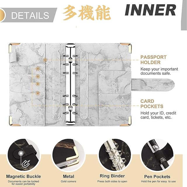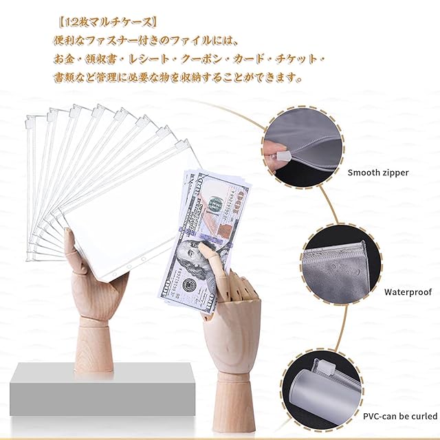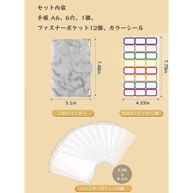 【大容量予算バインダー】ファスナー付きPVC素材のファイル:12枚この一体化した予算ルーズリーフは領収書やレシートなどを収納でき予算管理が非常にしやすいです。 便利なファスナー付きのファイルには、お金・領収書・レシート・クーポン・カード・チケット・書類など管理に必要な物を収納することができます。すべての年齢層にぴったりで、お金を整然とさせます!<br/>【実用A 6ルーズリーフバインダー】前後セットには複数のパスケースとペン環があり、ペン、身分証明書、VIPカード、銀行カード、パスポートを簡単に保管することができます。6つのステンレス製ルーズリーフバインダーは、脱落を防ぐために柔軟に物品を追加または除去することができます。磁気バックルは緊密に閉じることができます。<br/>【高級感のあるデザイン】カバーは高品質なPUレザーを使用しているので、非常に高級感のあるデザインになっています。また高級感のある見た目ですが。A 6ルーズリーフバインダーのサイズは7.5 x 5.1インチで、軽量で持ちやすく、家庭、オフィス、自動車、学校、旅行に便利で、バッグ、リュック、スーツケース、デスクに簡単に入れることができる<br/>【予算の秩序性を保つ】現金財テクは手軽で携帯性があり、いつでもどこでもお金を整理します。A 6ルーズリーフを使用すると、すべてのお金の行方がわかります。現金封筒付きの予算ルーズリーフは、お金を管理し、予算目標を達成するのに役立ちます。<br/>【素敵なプレゼント】召集された予算ルーズリーフは良いツールで、人々が自分の財務状況を追跡するのに役立ちます。そのため、貯蓄ルーズリーフはよく消費し、債務から離れたい人の完璧なプレゼントになります