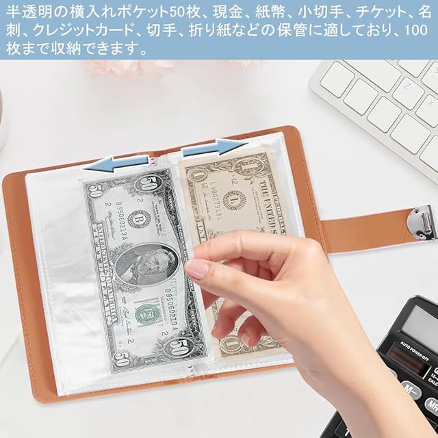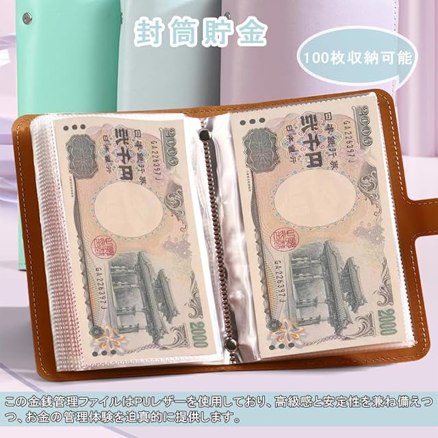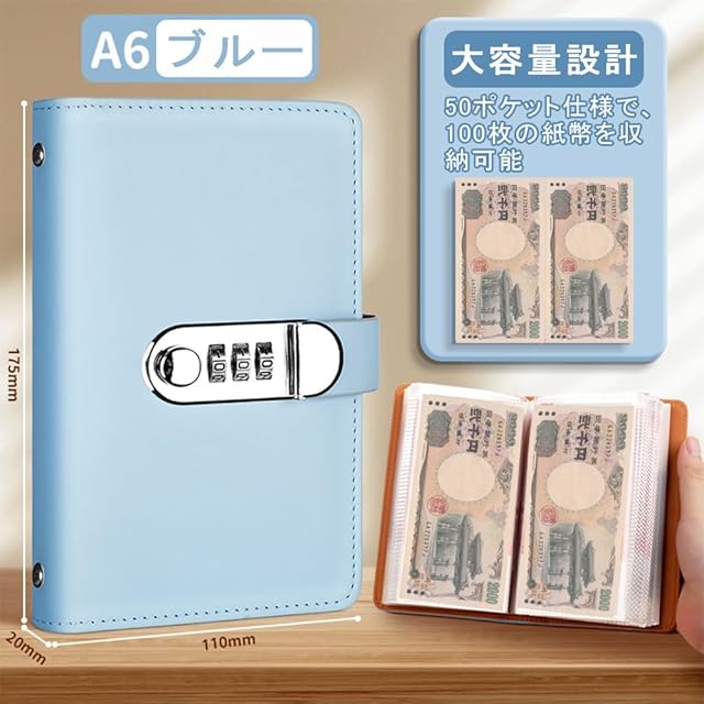 商品名:KALOLINNA 貯金ファイル 貯金箱 お札 お金管理 家計管理 封筒貯金 鍵付き本型セーフ 100枚収納でき 大容量 透明内袋 予算バインダー 表面PUレザー 伝票/名刺/メモ紙/お札入れ