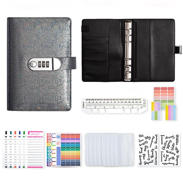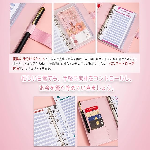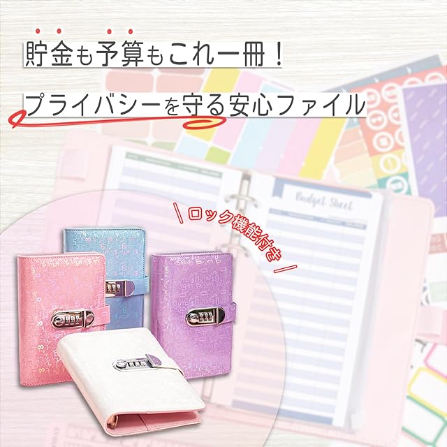 ✅内容:【セキュリティロック機能付き】 PU製バインダー・ジッパーポケット×8個・予算シート×12枚・英字ラベル・メモ用ラベル・DIYラベル・定規