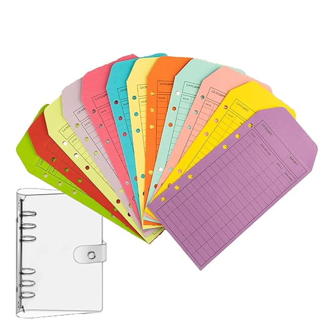LOYELEY 現金封筒 予算 6穴 お金管理 予算シート 家庭用 仕事用 予算シート お金管理 家計 (12色 12枚現金封筒+1枚透明バインダー)