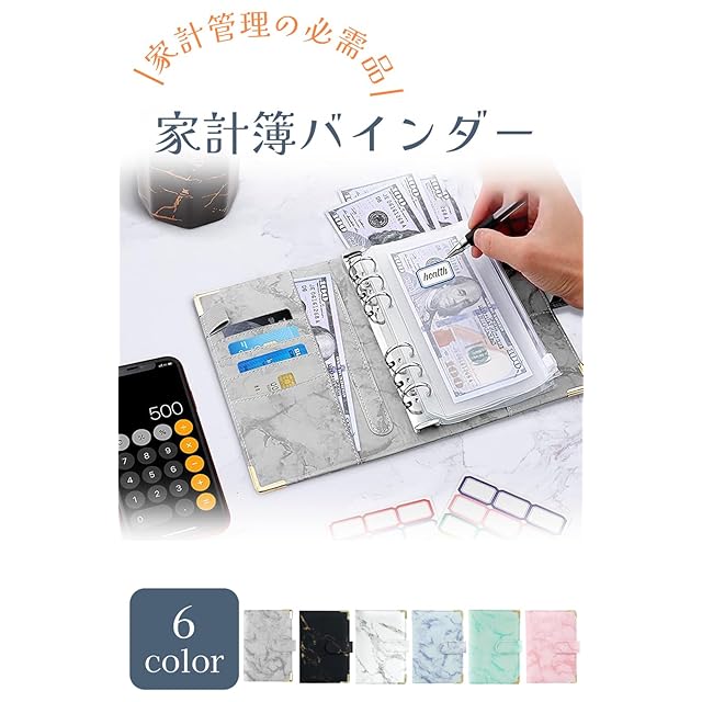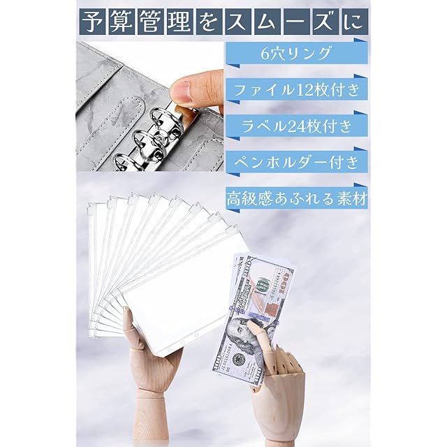 【大容量予算バインダー】手帳カバー(6穴リングルーズリーフバインダー)、ファスナー付きPVC素材のファイル12枚、ラベル24枚が含まれる。予算管理バインダー一式です。 【ラクラク予算管理】月間のお金を計算し、貯金をスムーズに行うことができます。領収書やレシートも収納できます。 【マルチケース】便利なファスナー付きファイルには、お金や領収書など管理に必要な物を収納することができます。 【商品サイズ】 19cm×13cm