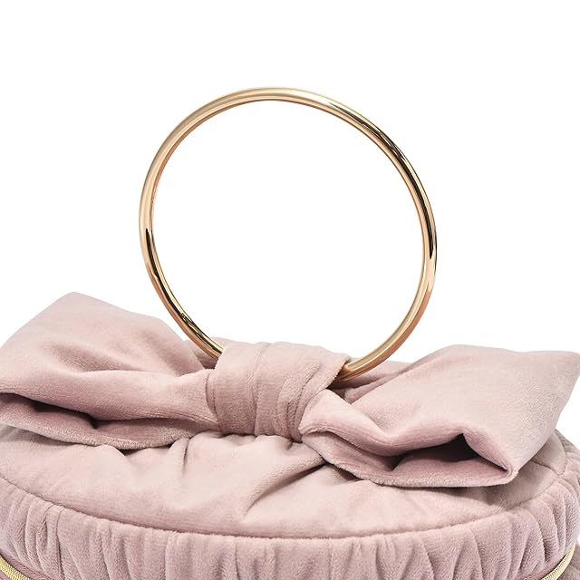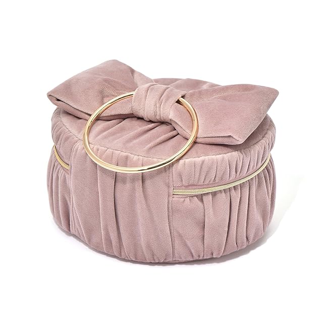光沢感のあるベロア生地で大きなリボンをあしらったポーチです。可愛らしいリボンモチーフと落ち着いた配色のバランスが絶妙で、普段使いに取り入れやすいデザイン。バニティポーチはキュートな円形に仕上げ、ゴールドのハンドルで高級感をプラスしました。